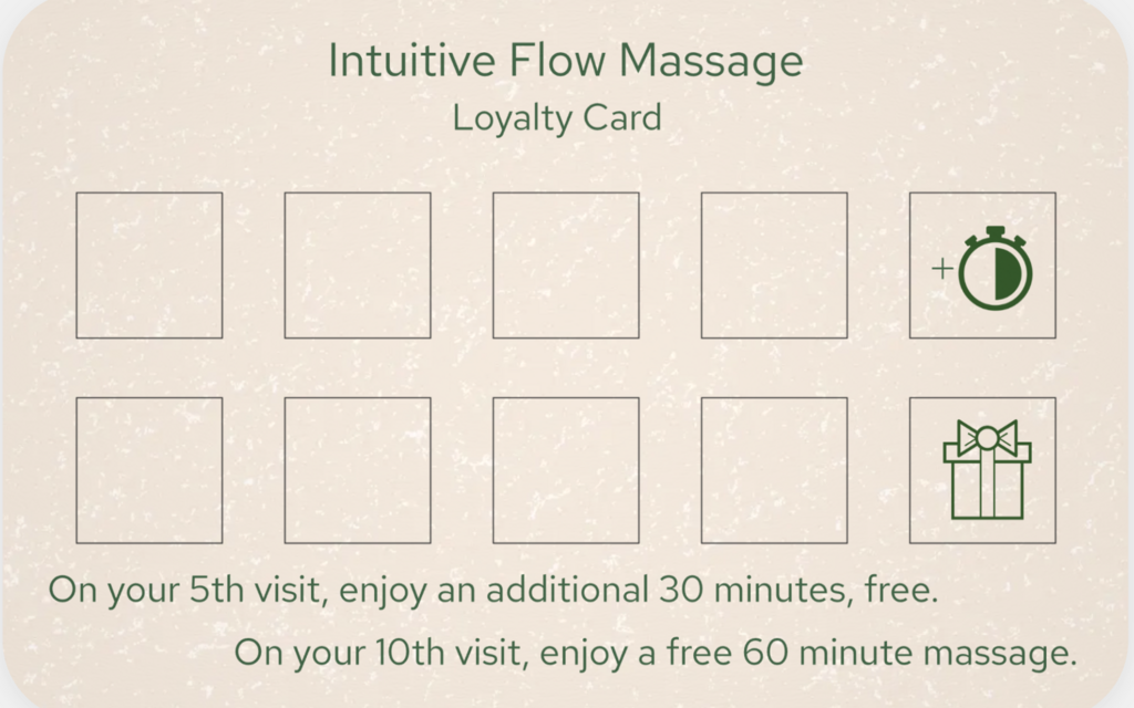 I occasionally offer discounts and special massage package bundles, which will be added to my instagram and booking site when available. Additionally, I have a loyalty rewards program shown here. If you have any questions, please don't hesitate to send me a message.